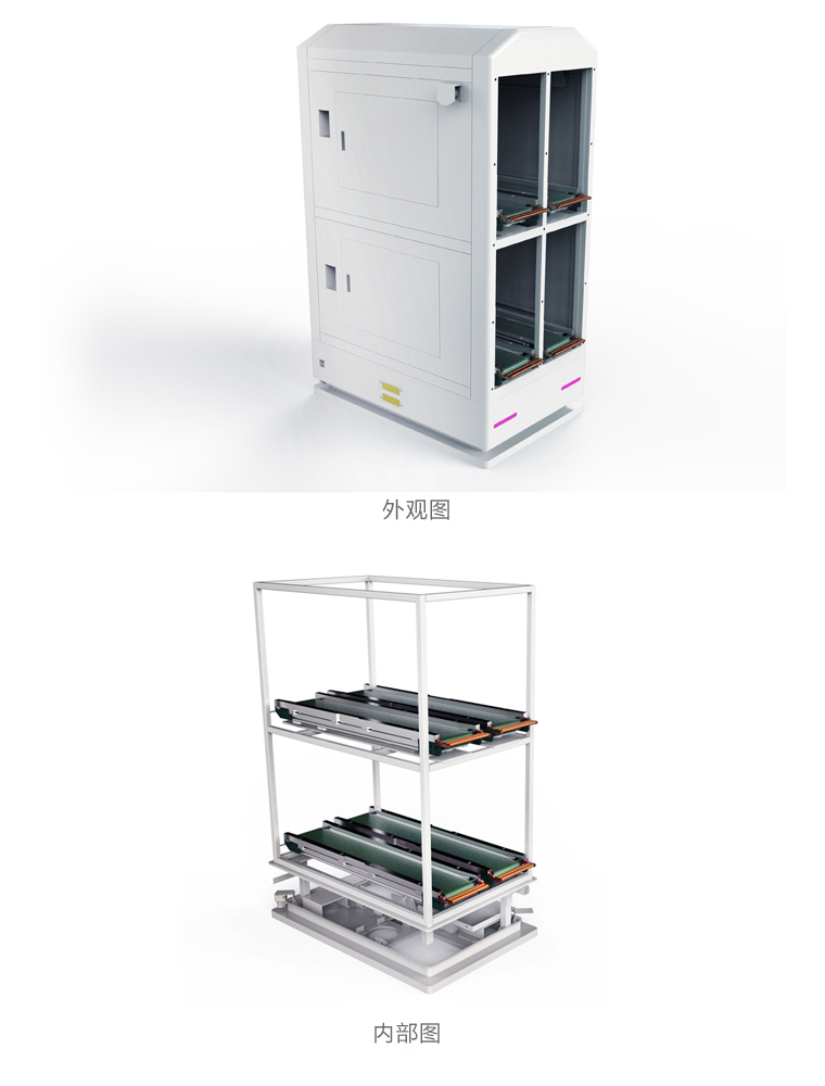 专用AGV用来搬运物料,背负皮带线输送到指定的上板机或下板机上面,实现空满交换料框,该AGV具有前进、后退、左右转功能,并且有横向移动功能,与设备对接时采用二次定位,保证5mm内的定位精度,实现了与设备的完美对接
